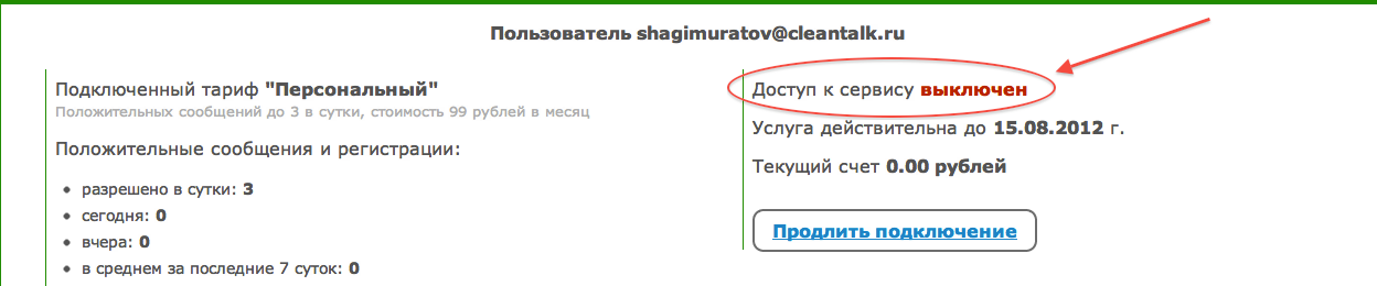 Проверьте пожалуйста статус подключения в Панели управления. Если доступ к сервису выключен и срок действия подписки закончился, то необходимо продлить подключение.
